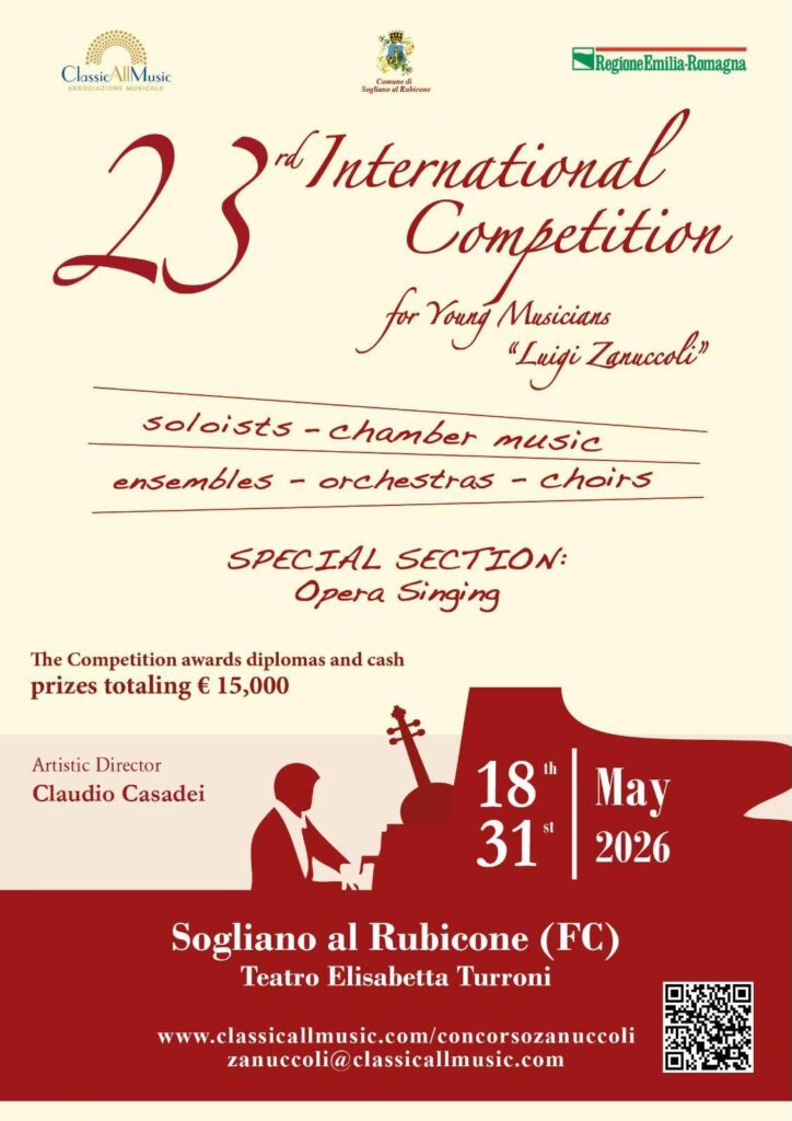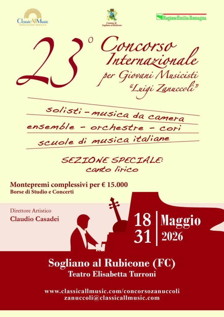 Sogliano al Rubicone FC – dal 18 maggio al 31 maggio 2026 , a Sogliano sul Rubicone, per il ventitreesimo anno consecutivo si rinnova la magia musicale del Concorso Luigi Zanuccoli. Sono centinaia i giovani musicisti che anche quest’anno si esibiranno sul palco del Teatro Elisabetta Turroni. Si parte dal 20 maggio con partecipanti delle scuole a indirizzo musicale provenienti da tutta l’Italia. Fanno seguito le sezioni Solisti , la sezione speciale di Canto Lirico e flauto solista. I premi per ciascuna sezione sono tanti e tutti significativi, per un valore totale di quindicimila euro. Oltre a importanti premi in borse di studio (fino a 2.000 euro), i vincitori riceveranno concerti , buoni acquisto per spartiti e strumenti da studio .